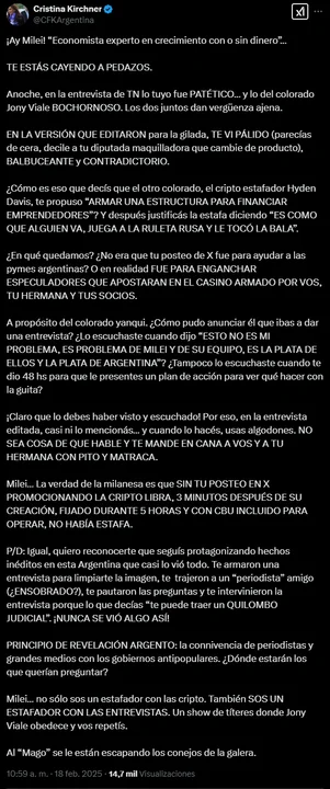 La ex mandataria también cuestionó la relación del presidente con Hayden Davis, desarrollador de Libra, y lo acusó de haberse beneficiado con la promoción de la criptomoneda. "¿Cómo es eso que decís que el otro colorado, el cripto estafador Hayden Davis, te propuso ‘armar una estructura para financiar emprendedores’? Y después justificás la estafa diciendo ‘es como que alguien va, juega a la ruleta rusa y le tocó la bala’", escribió.
