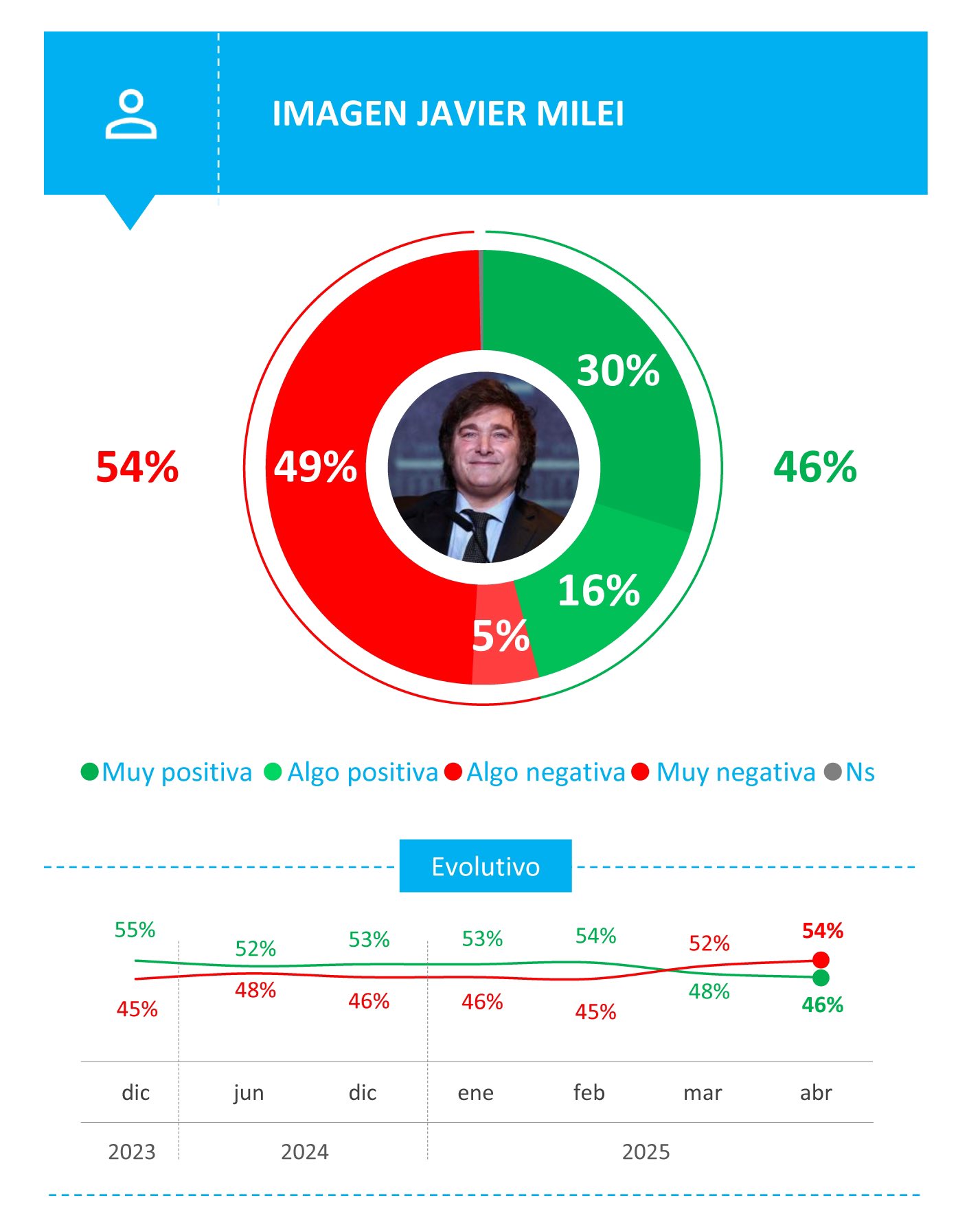 Primero, Milei sigue liderando, pero en baja. El Presidente volvió a encabezar la tabla con un 46% de imagen positiva, pero sufrió una nueva caída: perdió ocho puntos en solo dos meses, tras haber alcanzado un 54% en febrero. La desaprobación a su gestión y la percepción negativa del rumbo económico empiezan a reflejarse en las encuestas.