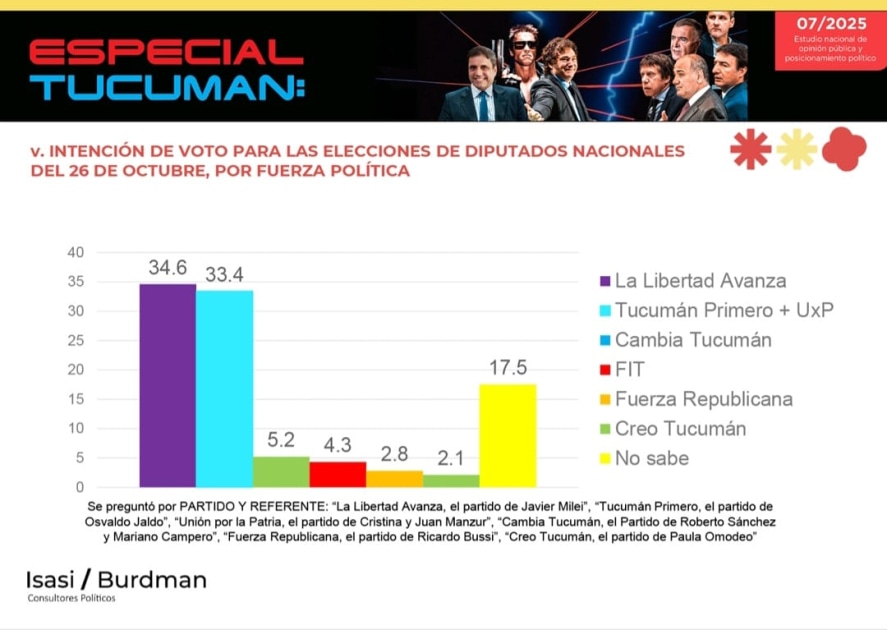 El sondeo, realizado entre el 6 y 12 de julio en nueve ciudades, muestra un electorado desencantado: 11.3% votaría en blanco y 12.9% está indeciso. Otros perdedores claros son Ricardo Bussi (4.6%) y Juan Manzur, cuya imagen negativa alcanza el 51.4%. En contraste, la intendenta Rossana Chahla tiene la mejor valoración (51% positiva), aunque no compite en estos comicios.