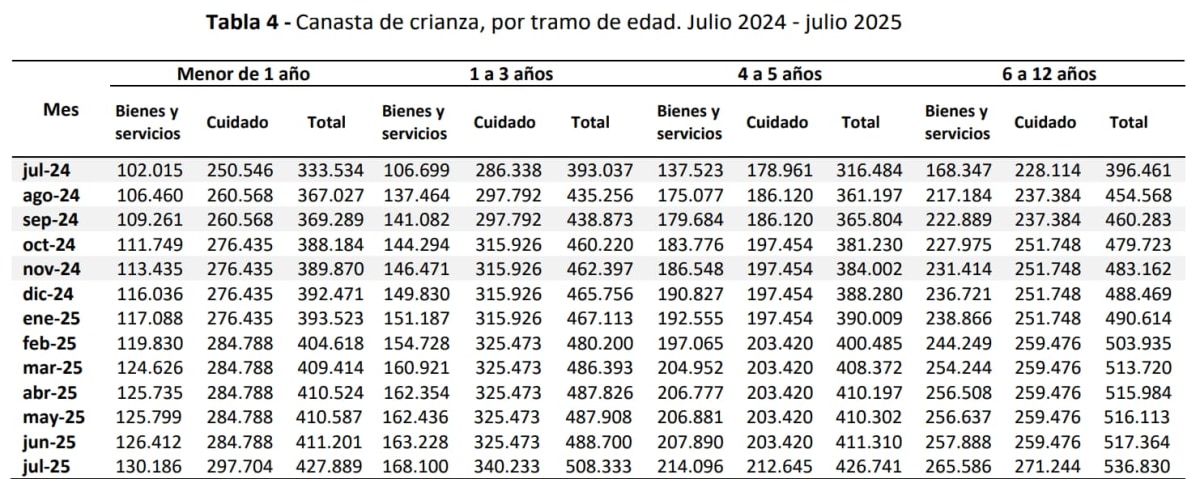 El informe, elaborado bajo metodología del INDEC y lineamientos del Ministerio de Economía nacional, desglosa los valores por tramos etarios. Criar un menor de 1 año requiere $427.889 mensuales, mientras que el grupo de 1 a 3 años presenta el mayor costo ($508.333). Para niños de 4 a 5 años el valor es de $426.741, y para el rango de 6 a 12 años alcanza los $536.830, este último impulsado por necesidades educativas y alimentarias propias de la edad escolar.