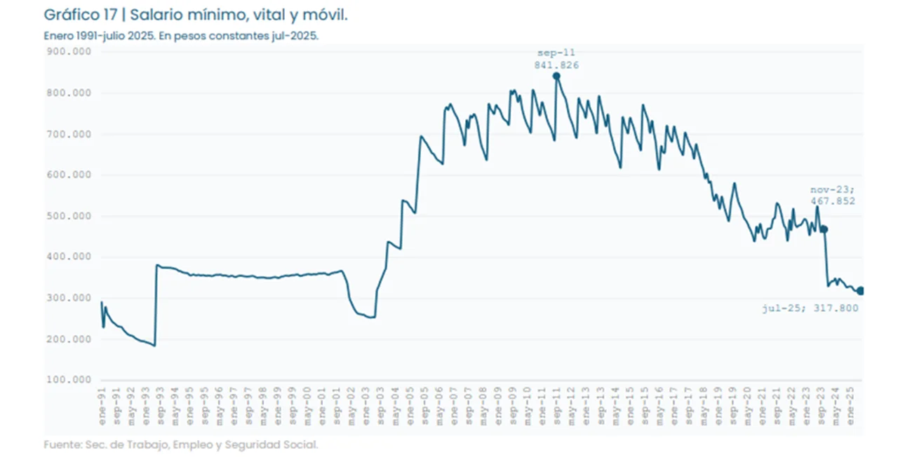 El informe concluye que, en términos reales, el valor actual del SMVM se sitúa por debajo del nivel observado en septiembre de 2001 y representa una erosión del 62% respecto de su punto máximo histórico, alcanzado en septiembre de 2011.