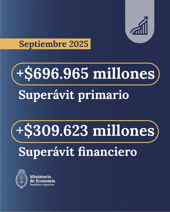 El Sector Público Nacional (SPN) registró en septiembre un superávit financiero de $309.623 millones, consolidando el noveno mes consecutivo de resultados positivos en las cuentas públicas, según informó este jueves el Ministerio de Economía.