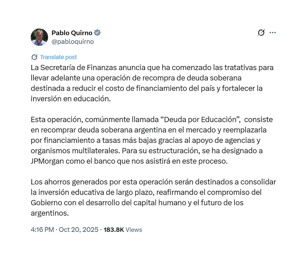 “La Secretaría de Finanzas anuncia que ha comenzado las tratativas para una operación de recompra de deuda soberana destinada a reducir el costo de financiamiento del país y fortalecer la inversión en educación”, escribió Quirno. Fuentes del Ministerio de Economía confirmaron que la operación se centrará en bonos emitidos en moneda extranjera.