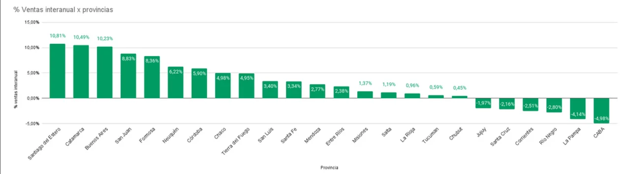 A nivel geográfico, 18 de los 24 distritos del país tuvieron variaciones interanuales positivas. Santiago del Estero registró la mayor recuperación (10,81%), seguida por la provincia de Buenos Aires (10,49%) y San Juan (10,23%). Por el contrario, la Ciudad de Buenos Aires encabezó las caídas por octavo mes consecutivo con una merma del 4,98%, acompañada por La Pampa (-4,14%) y Río Negro (-2,8%).