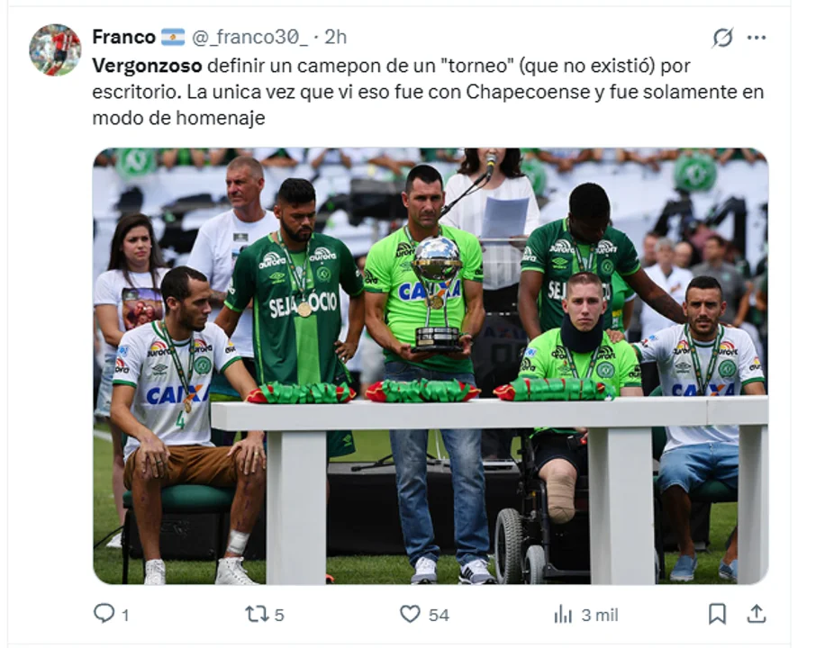 El centro de la indignación digital se ubicó en la ausencia de una competencia directa por el trofeo. Numerosos hinchas contrastaron la situación con el título honorífico otorgado al Chapecoense brasileño tras la tragedia aérea de 2016, calificando al caso de Rosario Central como un "regalo" y una "vergüenza".