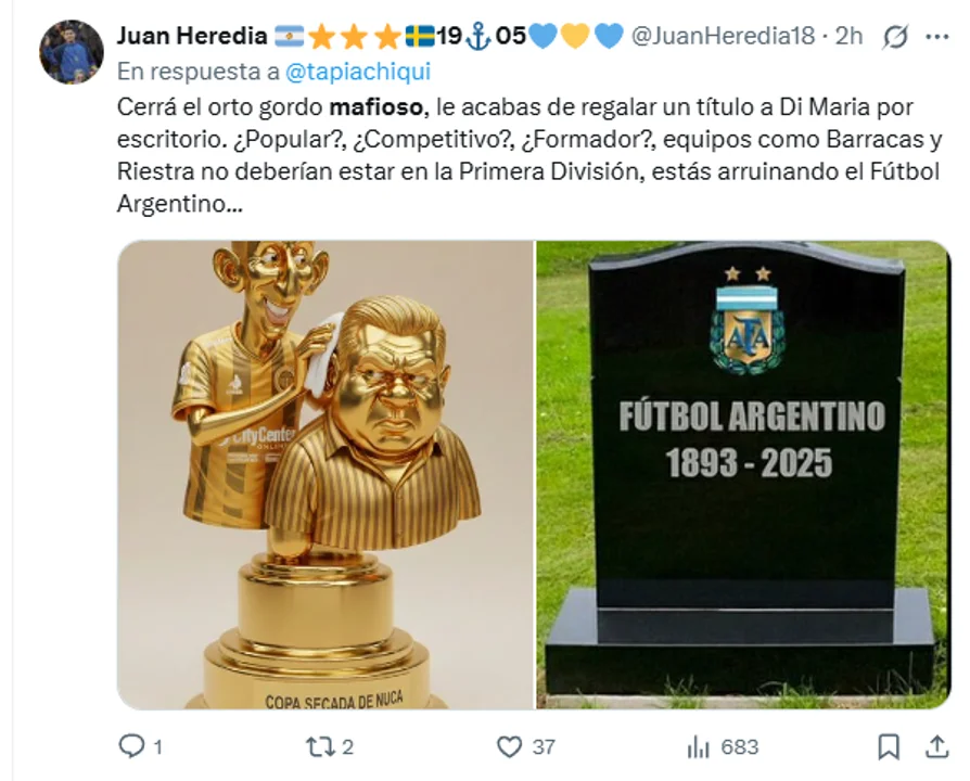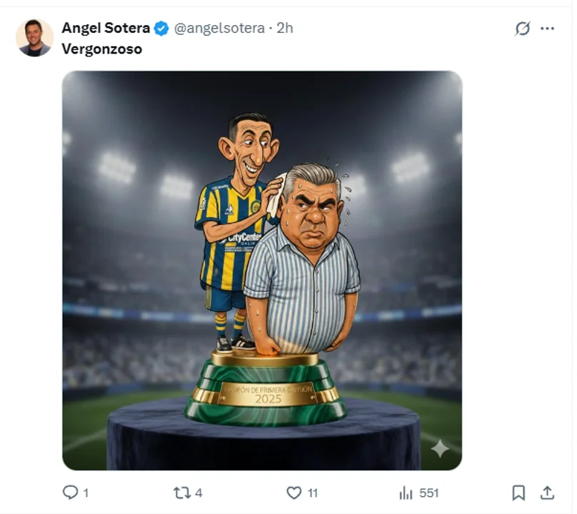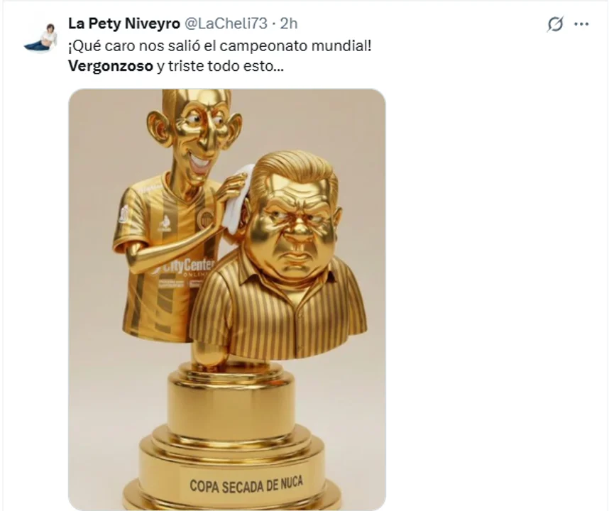 La presencia de Di María se convirtió en uno de los focos centrales de las críticas digitales. Diversas ilustraciones y memes que circularon en la plataforma mostraron caricaturas del presidente de la AFA, Claudio "Chiqui" Tapia, entregando la copa al ídolo de la Selección en un entorno de oficina, poniendo en tela de juicio el mérito deportivo de la consagración.