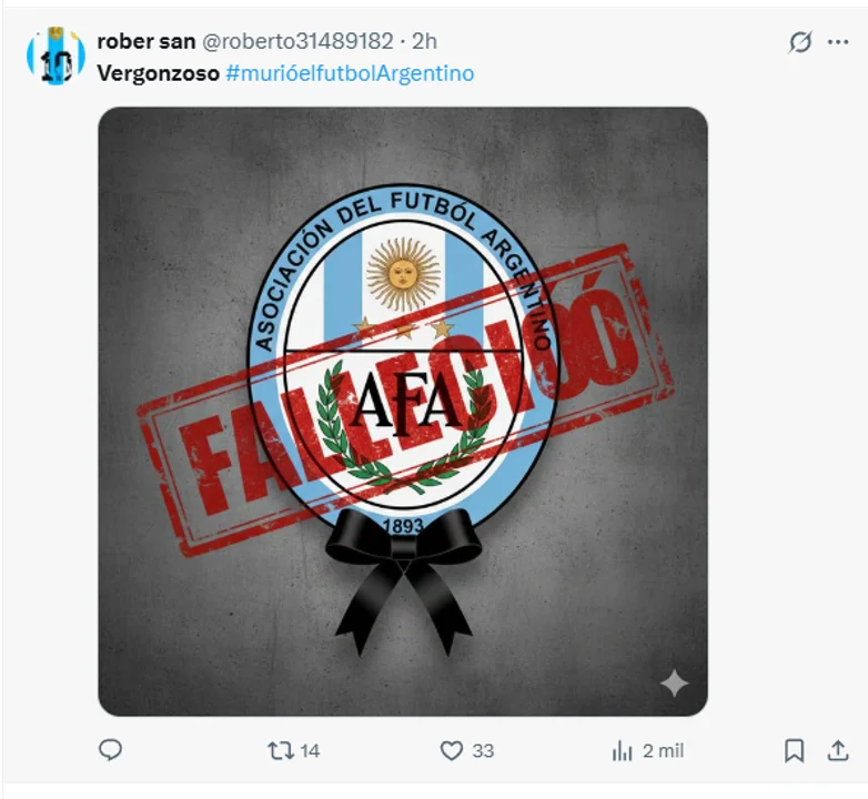 Entre las publicaciones más virales, usuarios decretaron simbólicamente el fin de la credibilidad del fútbol nacional mediante imágenes de lápidas con las inscripciones "Fútbol Argentino 1893 - 2025" y sellos de "FALLECIO" superpuestos sobre el escudo de la AFA.