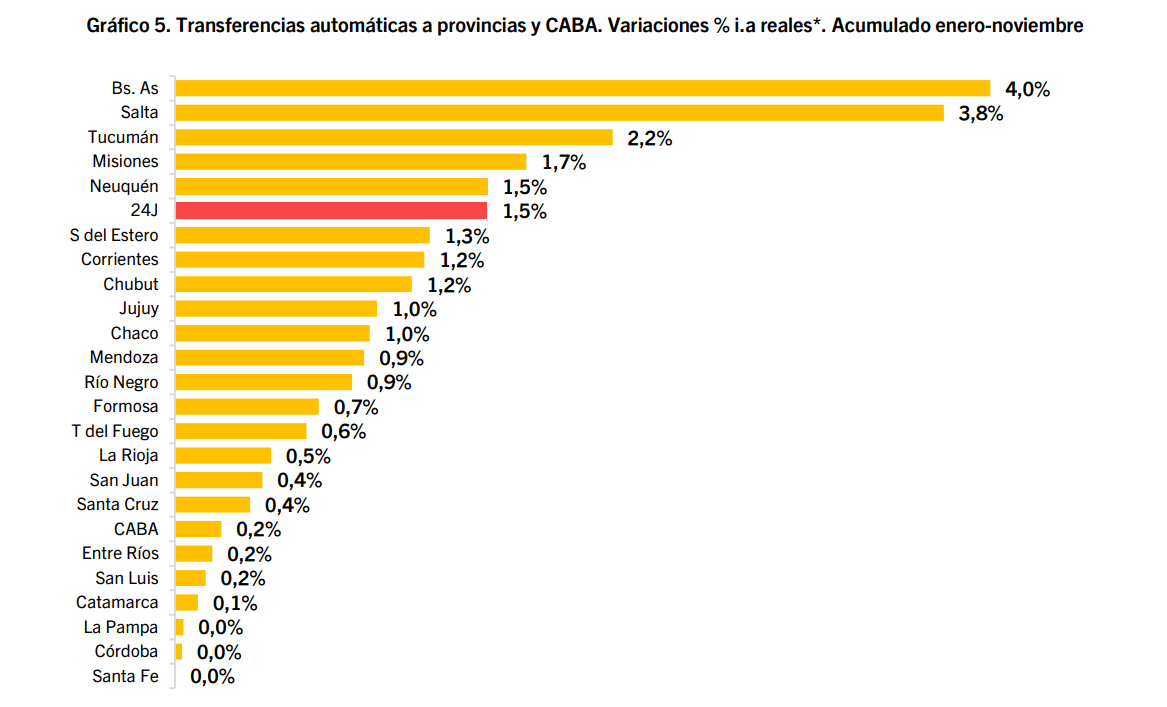 En el acumulado de once meses, las provincias recibieron $54,54 billones, con un crecimiento real del 1,5%. Sin embargo, al ajustar por inflación, el monto se sitúa por debajo de los niveles de 2023, 2022 y 2021. En este contexto, apenas tres provincias registran una variación real positiva en el año, con Buenos Aires a la cabeza (4% real) y Tucumán en el tercer lugar (2,2% real).