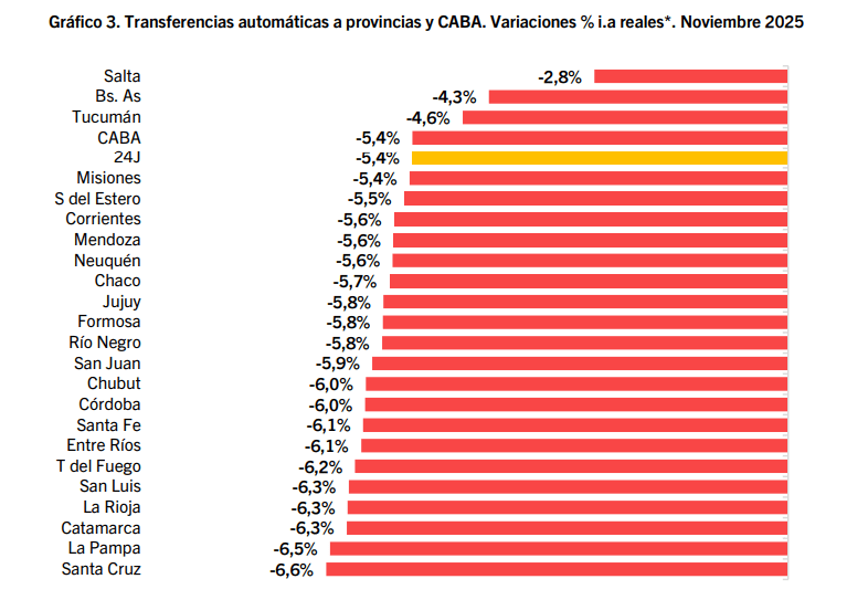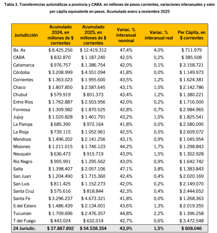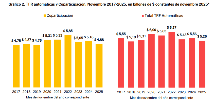 A nivel nacional, el informe revela que las transferencias automáticas al total de provincias y CABA sumaron $5,26 billones en noviembre, con una caída real del 5,4% interanual, impulsada principalmente por la baja en la recaudación del IVA y Ganancias. Los envíos por coparticipación (el 92,7% del total) retrocedieron un 5,5% real.