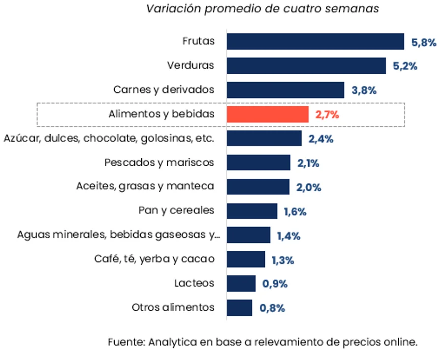 Un informe de Analytica proyecta que, si el ritmo se mantiene, el rubro cerraría el mes con un alza del 2,7%. Frutas, verduras y carnes lideran los aumentos en las últimas cuatro semanas.