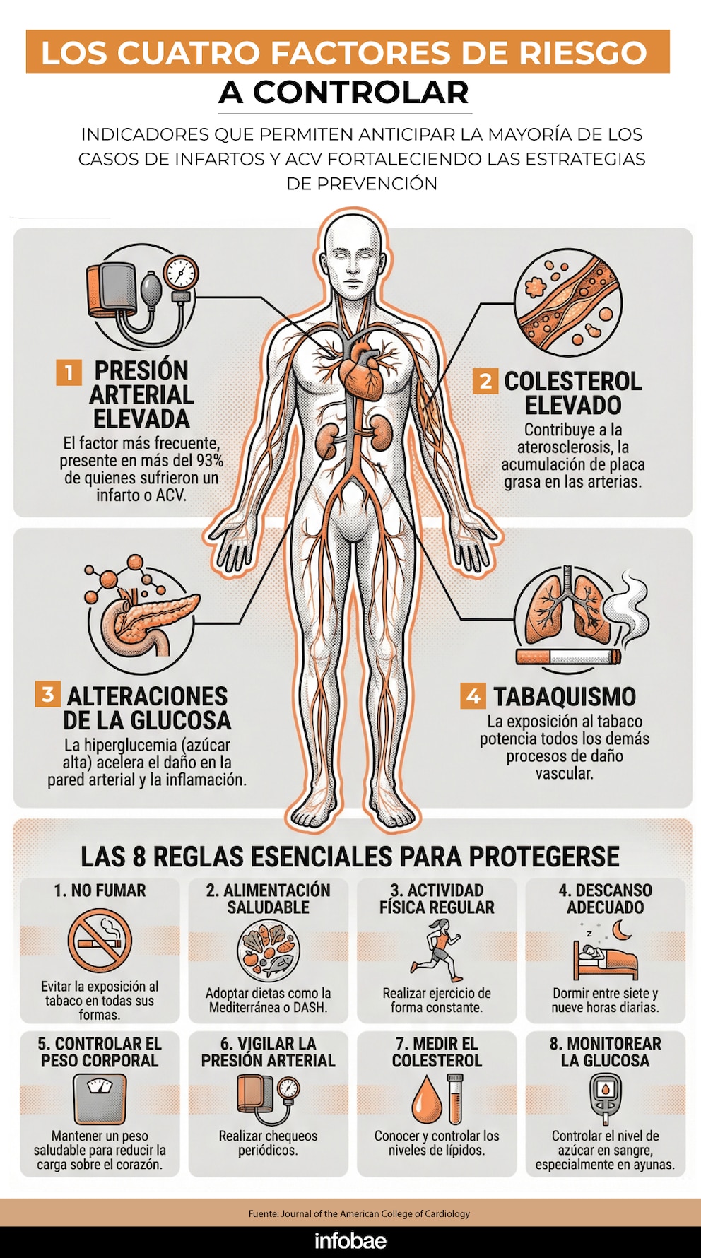 Según explicó a Infobae el cardiólogo Juan Pablo Costabel, jefe de la Unidad Coronaria del ICBA Instituto Cardiovascular, “más del 99% de quienes desarrollaron un infarto, un ACV o insuficiencia cardíaca habían presentado previamente al menos uno de los cuatro factores de riesgo tradicionales: presión arterial elevada, colesterol elevado, alteraciones de la glucosa o exposición al tabaco”.