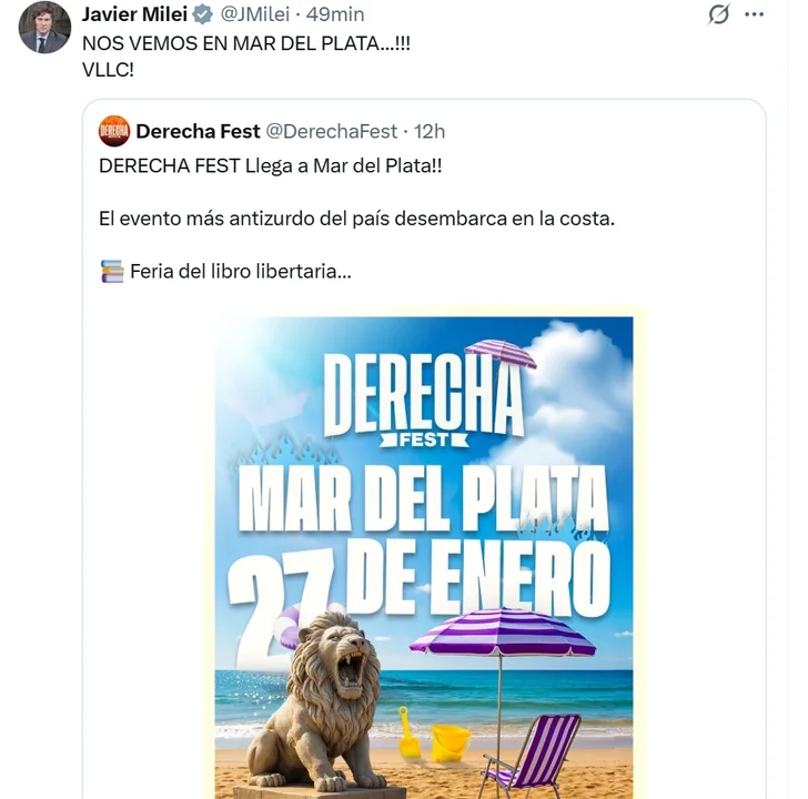 A través de su cuenta en la red social X, el Presidente publicó un breve mensaje confirmando su presencia: “Nos vemos en Mar del Plata”. El evento es organizado por el biógrafo de Milei, Nicolás Márquez, y el medio Derecha Diario, dirigido por el español Javier Negre. En su promoción en redes, se lo describe como “el evento más antizurdo del país” y celebrará su primera edición del año en la ciudad balnearia.