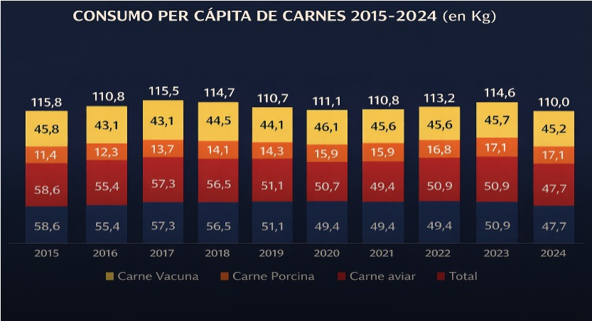 Los 116,5 kilos per cápita representan un aumento de 6,5 kilos respecto a los 110 kilos consumidos en 2024. El desglose por tipo de carne es el siguiente: