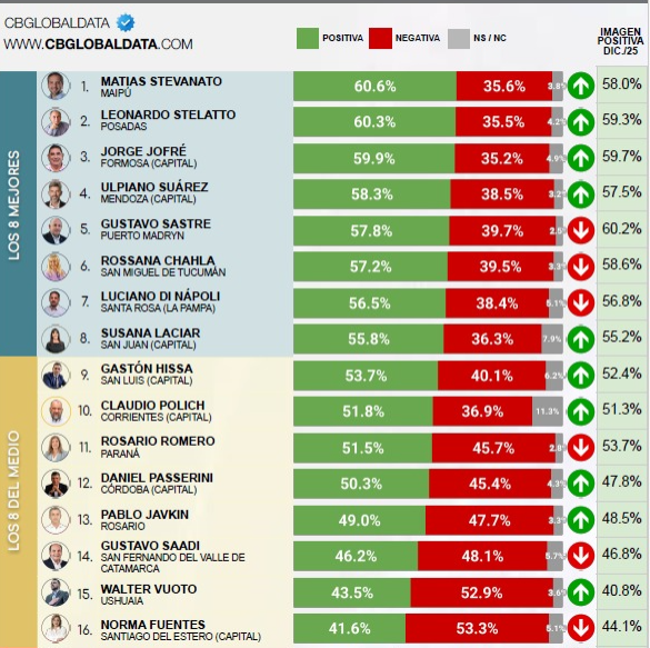 En la medición actual, Chahla registra 56,5% de imagen positiva y 38,4% de negativa, ubicándose en el 6° lugar del ranking nacional de intendentes. Si bien el número sigue siendo competitivo en términos absolutos, el dato relevante es la comparación temporal: en diciembre de 2025, su imagen positiva alcanzaba el 58,6%, lo que implica una caída de 2,1 puntos en apenas dos meses, dentro de un proceso descendente más amplio iniciado en el segundo semestre del año pasado.