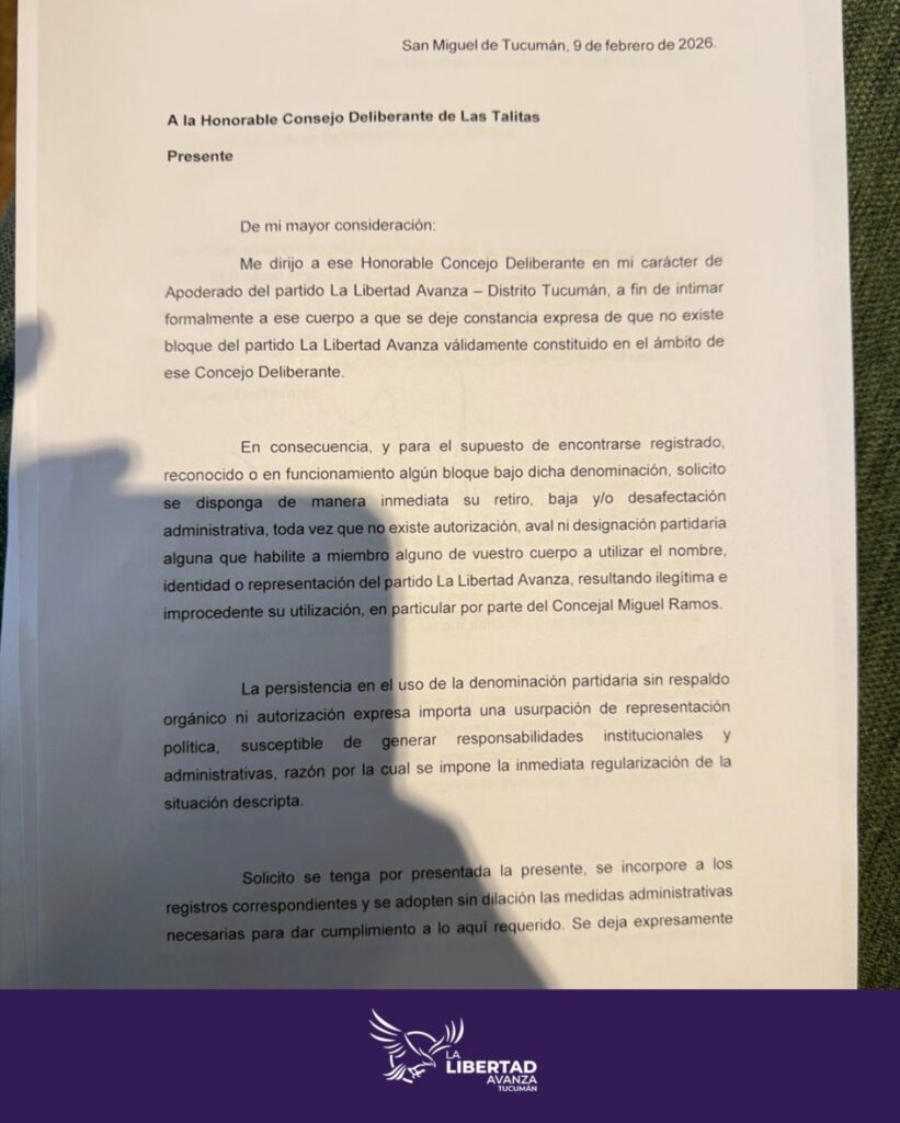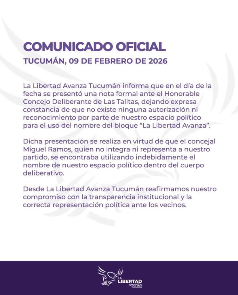 En el comunicado, LLA Tucumán "hace saber que Miguel Ramos no pertenece al partido" y advierte a las autoridades del Concejo Deliberante de Las Talitas que "no existe ninguna autorización ni reconocimiento para el uso del nombre de bloque de La Libertad Avanza".