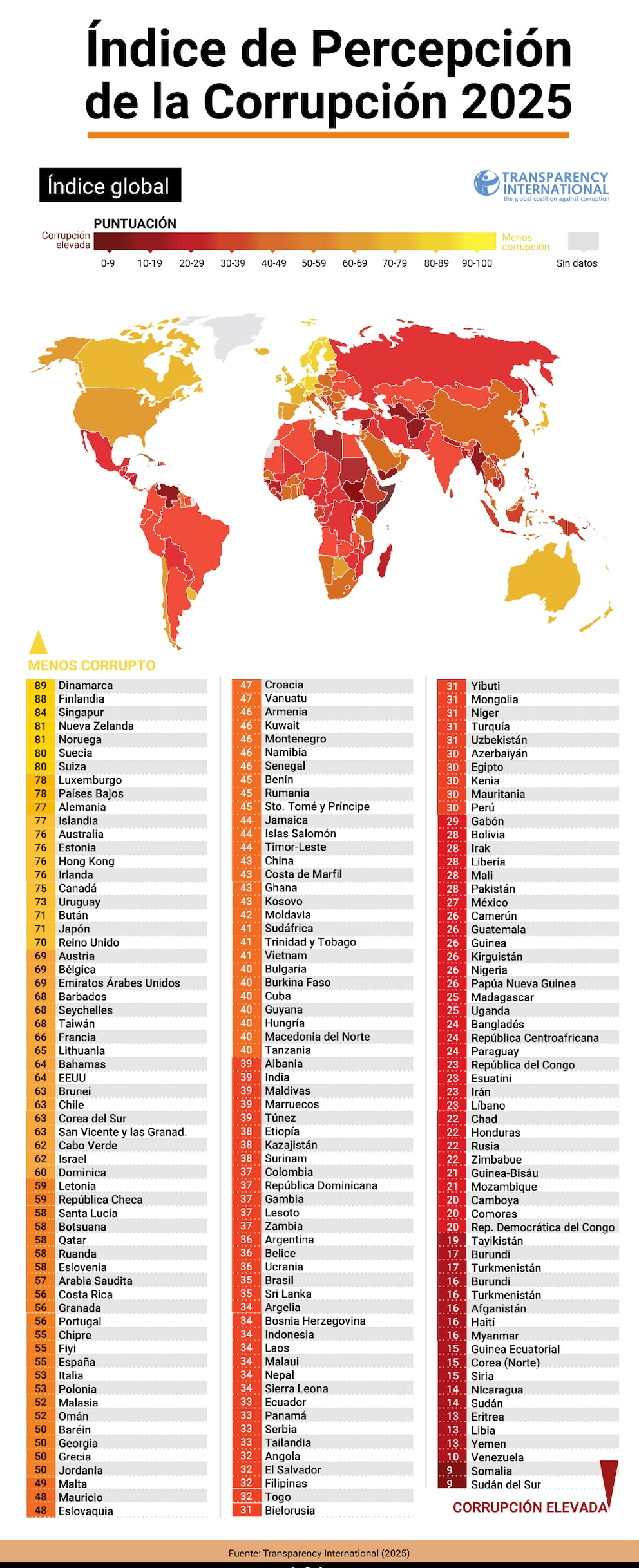 Según la edición 2025 del índice (CPI, por sus siglas en inglés), Argentina obtuvo 36 puntos sobre 100, un punto menos que el año anterior. El ranking es liderado por Dinamarca (89 puntos) y Finlandia (88), mientras que en el otro extremo se ubican Sudán del Sur y Somalia (9 puntos).