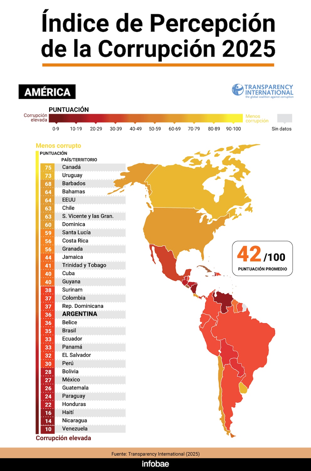 Este puntaje ubica al país por debajo del promedio del continente americano, que es de 42 puntos. Argentina aparece junto a naciones como Belice y Ucrania, y es superada por países como Zambia, Lesoto, Gambia y República Dominicana.