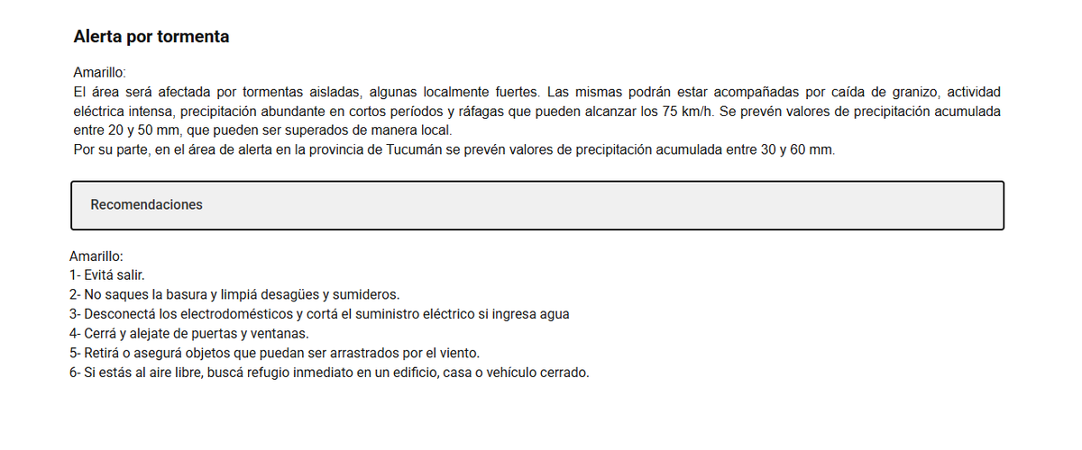 El nivel amarillo implica la posibilidad de fenómenos meteorológicos con capacidad de daño y riesgo de interrupción momentánea de actividades cotidianas. Desde el organismo recomiendan no sacar la basura, retirar objetos que impidan que el agua escurra, evitar actividades al aire libre y no refugiarse cerca de árboles o postes de electricidad.