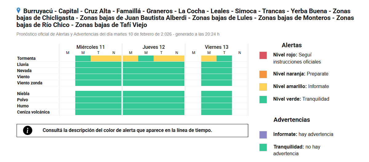 La provincia de Tucumán permanecerá bajo alerta amarillo por tormentas fuertes desde la tarde de este miércoles y al menos hasta la madrugada del viernes, según informó el Servicio Meteorológico Nacional (SMN).