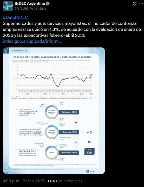 El Instituto Nacional de Estadística y Censos (INDEC) publicó este lunes el Indicador de Confianza Empresarial (ICE) correspondiente al rubro de supermercados y autoservicios mayoristas, con datos de la evaluación de enero de 2026 y las expectativas para el trimestre febrero-abril del mismo año.