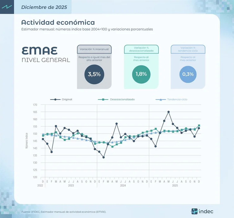 La actividad económica argentina cerró 2025 con un crecimiento acumulado del 4,4%, según informó este martes el Instituto Nacional de Estadística y Censos (INDEC) a través del Estimador Mensual de Actividad Económica (EMAE). El dato correspondiente a diciembre mostró un incremento del 3,5% en la medición interanual y una suba del 1,8% respecto de noviembre, la más alta desde julio de 2024.