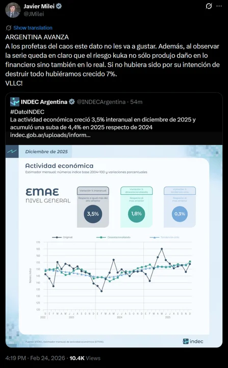 El presidente Javier Milei se refirió este martes al crecimiento del 4,4% que registró la actividad económica durante 2025, según el dato difundido por el Instituto Nacional de Estadística y Censos (INDEC), y afirmó que "Argentina avanza".