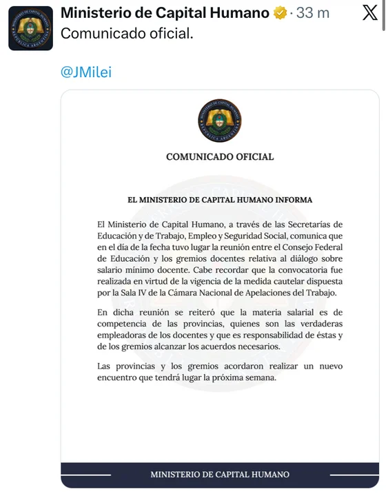 En un comunicado oficial, la cartera que conduce Sandra Pettovello informó que durante el encuentro "se reiteró que la materia salarial es de competencia de las provincias, quienes son las verdaderas empleadoras de los docentes y que es responsabilidad de éstas y de los gremios alcanzar los acuerdos necesarios" .