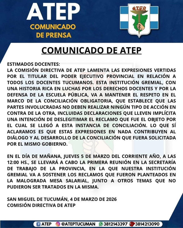 A menos de 24 horas de la primera reunión paritaria con el gobierno provincial, la Agremiación Tucumana de Educadores Provinciales (ATEP) emitió un comunicado oficial en el que manifestó su malestar por declaraciones del gobernador Osvaldo Jaldo, a las que consideró lesivas para el proceso de diálogo abierto en el marco de la conciliación obligatoria .