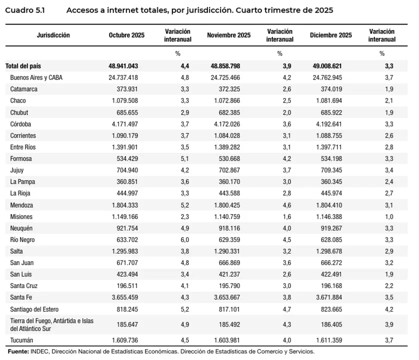 Finalmente, el relevamiento oficial incluye un detalle por jurisdicción. La provincia de Buenos Aires encabeza el ranking de accesos durante el cuarto trimestre de 2025, seguida por la Ciudad Autónoma de Buenos Aires y Catamarca, que completan los primeros tres lugares en materia de conectividad a nivel nacional.