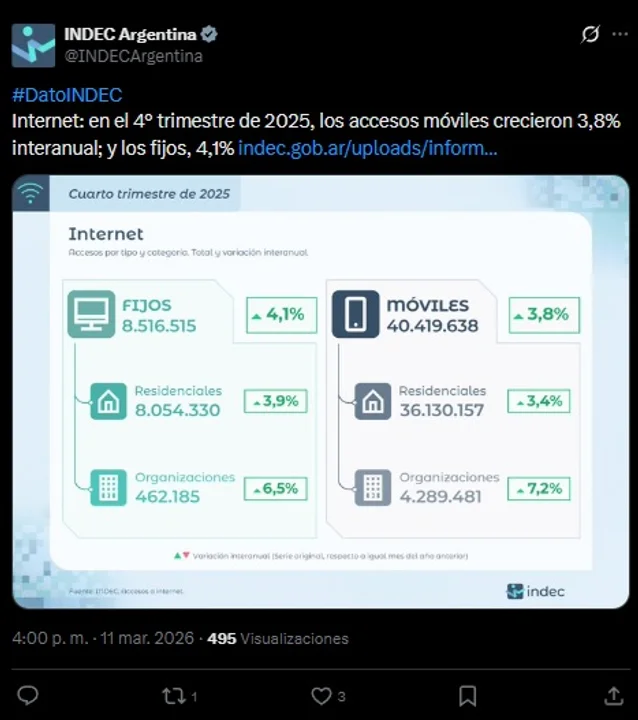 Accesos a internet en Argentina: el INDEC reveló cuánto crecieron las conexiones fijas y móviles en el cierre de 2025