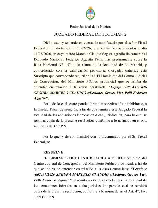La investigación por la agresión sufrida por el diputado nacional Federico Agustín Pelli en la Ruta Nacional 157, a la altura de la localidad de La Madrid, podría pasar al fuero federal luego de una resolución dictada por el Juzgado Federal N°2 de Tucumán, que solicitó formalmente la inhibición de la justicia provincial.