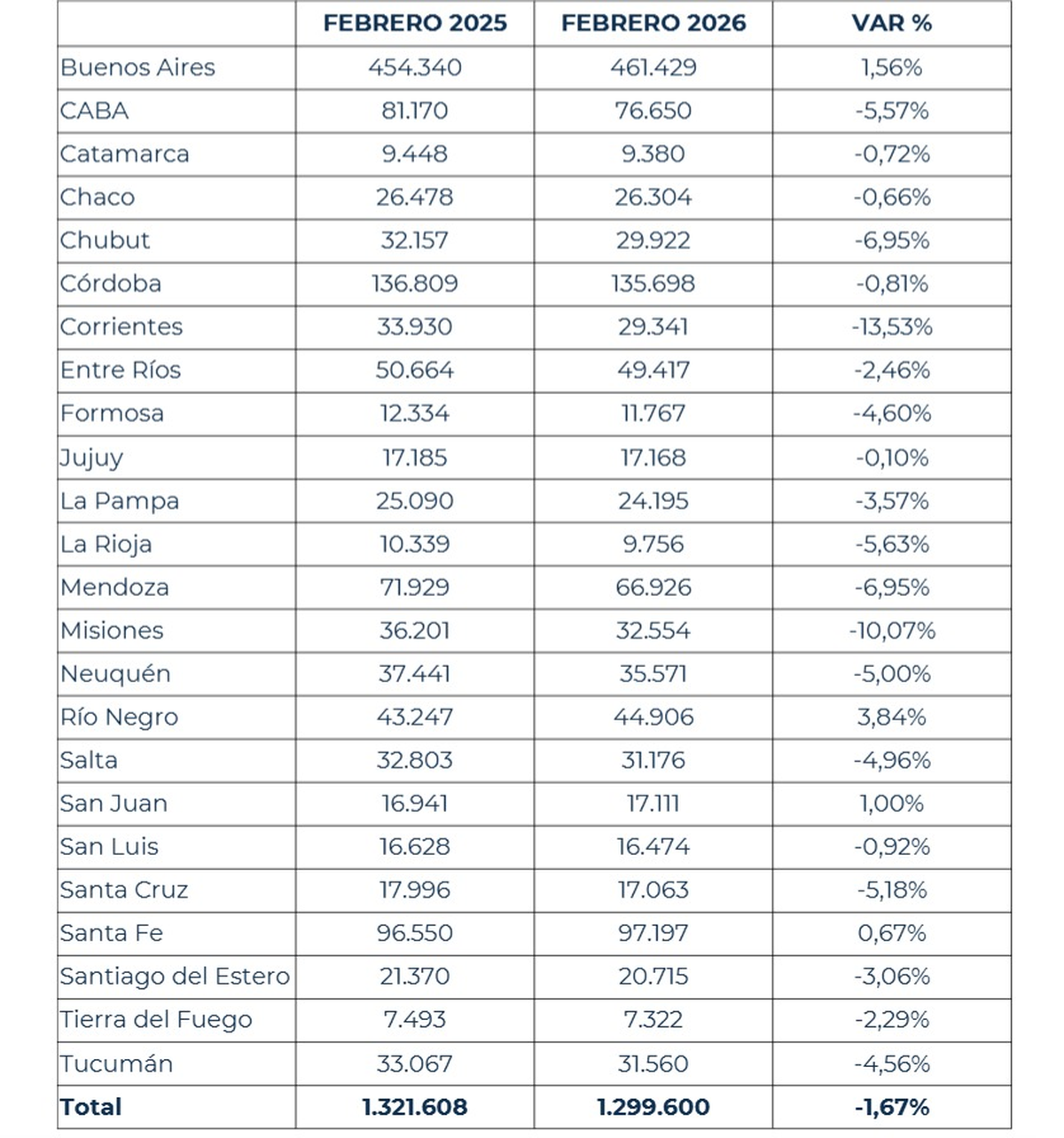 El mercado de combustibles registró en febrero una caída en las ventas al público en comparación con el mismo mes del año anterior. De acuerdo con el informe elaborado por Surtidores, durante el segundo mes del año se comercializaron 1.299.600 metros cúbicos, lo que representa una retracción del 1,67 por ciento respecto a febrero de 2025, cuando se habían vendido 1.321.608 metros cúbicos.