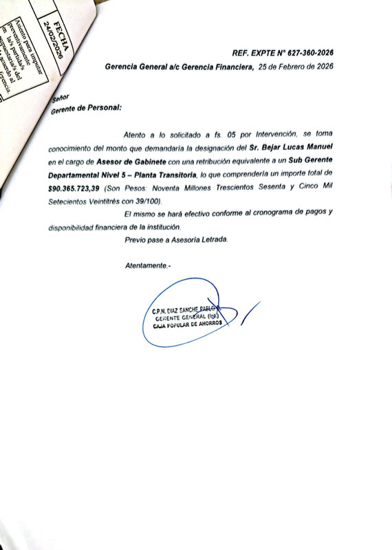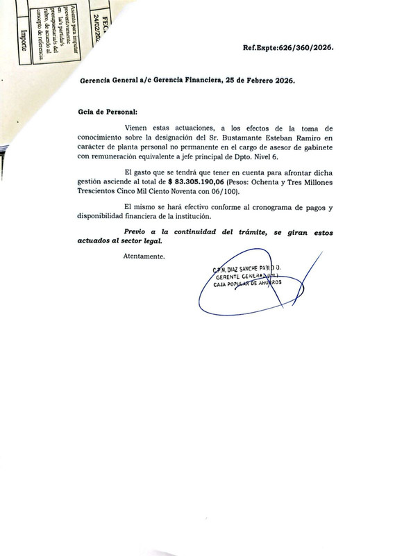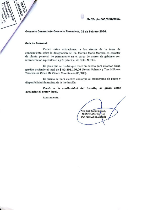 Apenas semanas después de haber asumido la intervención de la Caja Popular de Ahorros de Tucumán, los nuevos interventores realizaron una serie de nombramientos de alto costo en la entidad. Según documentos oficiales a los que accedió El Federalista, entre el 20 y el 25 de febrero de 2026, la Gerencia General aprobó trece designaciones en el cargo de “Asesor de Gabinete”, bajo la modalidad de planta transitoria.