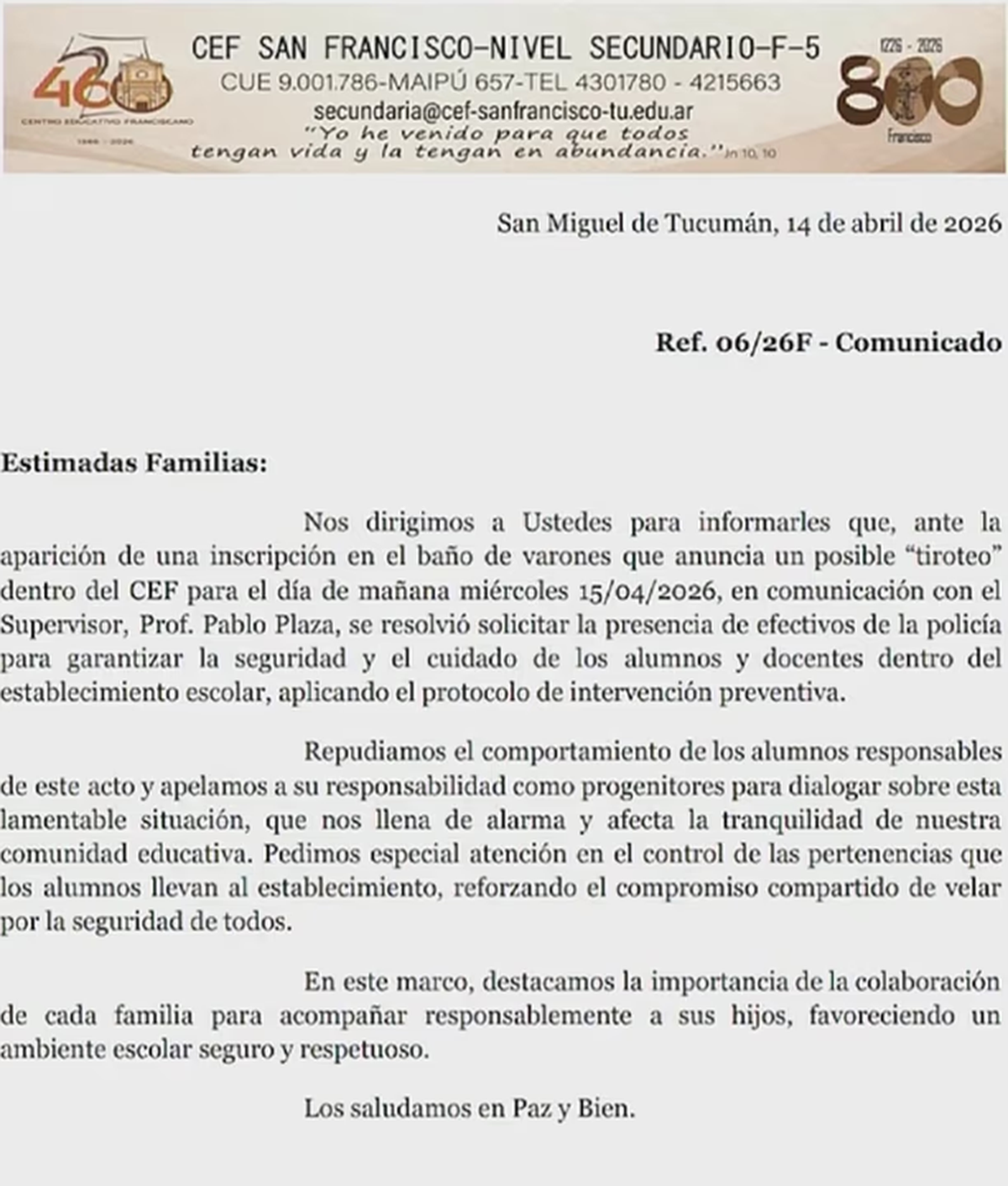 Por su parte, desde el CEF San Francisco emitieron un comunicado oficial en el que repudiaron las amenazas y alertaron a padres y alumnos. En el texto, la institución también informó que se dispuso un operativo de seguridad con presencia policial para evitar hechos que perturben la tranquilidad de la comunidad educativa. Asimismo, instaron a los padres a dialogar con sus hijos y a controlar los elementos y pertenencias con los que asisten a clases.