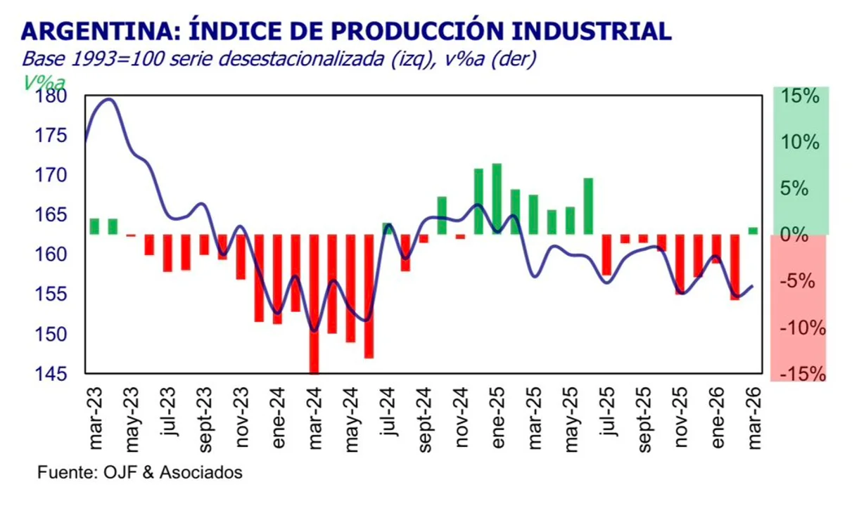 La producción industrial registró en marzo de 2026 una suba interanual del 0,7%, lo que permitió cortar una racha de ocho meses consecutivos en terreno negativo, según el Índice de Producción Industrial de Orlando J. Ferreres & Asociados. Sin embargo, el dato no alcanzó para revertir el resultado del primer trimestre, que finalizó con una caída acumulada del 3,1% respecto al mismo período del año anterior.