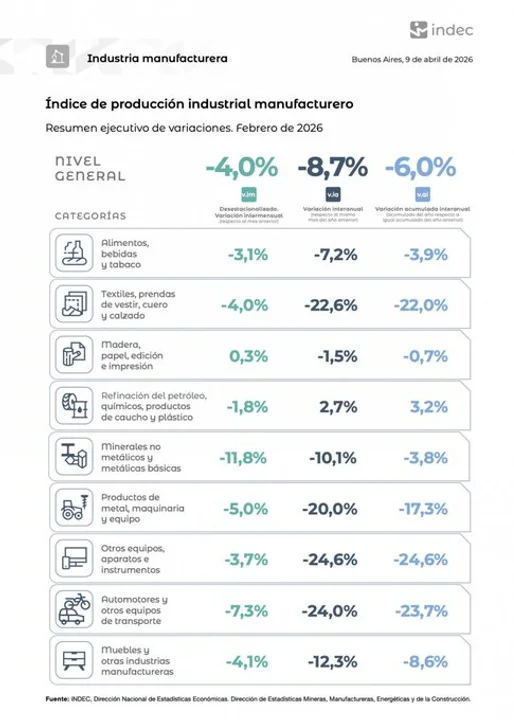 En contraste, varias ramas continuaron en retroceso. Las caídas más pronunciadas se registraron en plásticos (-14,3%), maquinaria y equipo (-5,3%), metales básicos (-2%) y la industria textil (-1,7%).